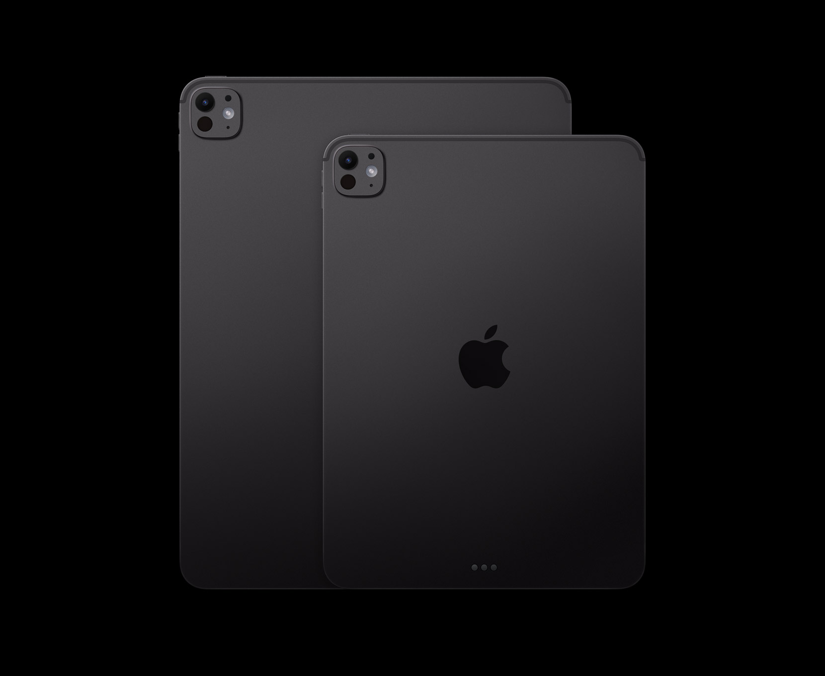 Accessories: Both models support the Apple Pencil Pro and have a landscape-oriented front-facing camera with Center Stage. The larger iPad uses a larger Magic Keyboard, while the smaller iPad uses a smaller one.